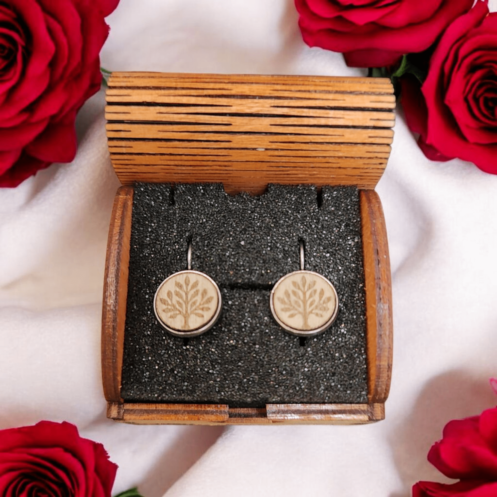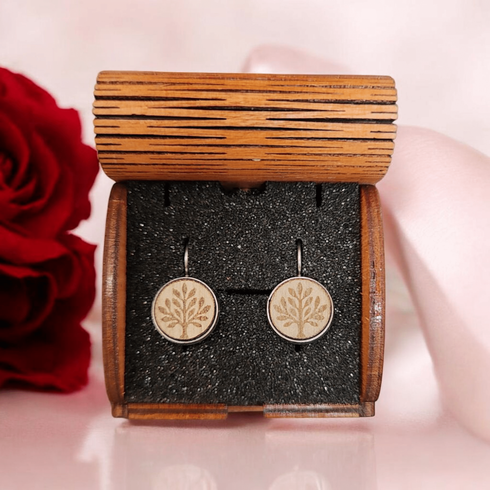 Naše náušnice jsou vyrobeny z kvalitní dřevěné dýhy. Nikoliv z překližky. Vyrábíme náušnice se záměrem na vysokou kvalitu dřeva a bižuterních komponentů. Jsme schopni vyrobit i náušnice dle vlastního návrhu. Používáme bižuterní komponenty z chirurgické oceli nebo stříbra. Nepoužíváme žádné laciné kovové náhražky. Pracujeme s prémiovým dřevem jako je Mahagon, Palisandr, Dub.